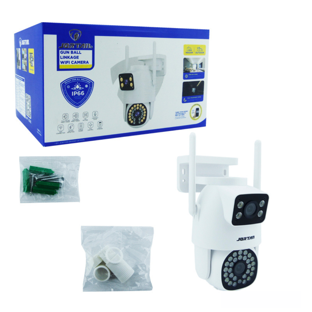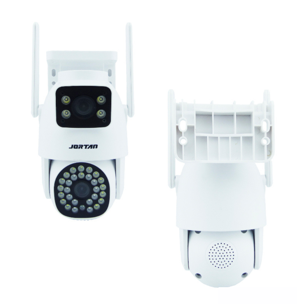 Cámara IP Jortan doble lente con 28+4 LED, conectividad WiFi + LAN y control desde APP ICSEE: monitoreo en tiempo real, acceso remoto y alertas por movimiento. Incluye accesorios de montaje.
