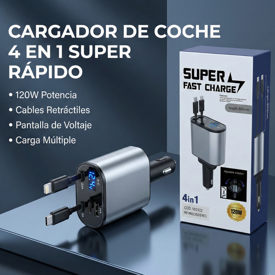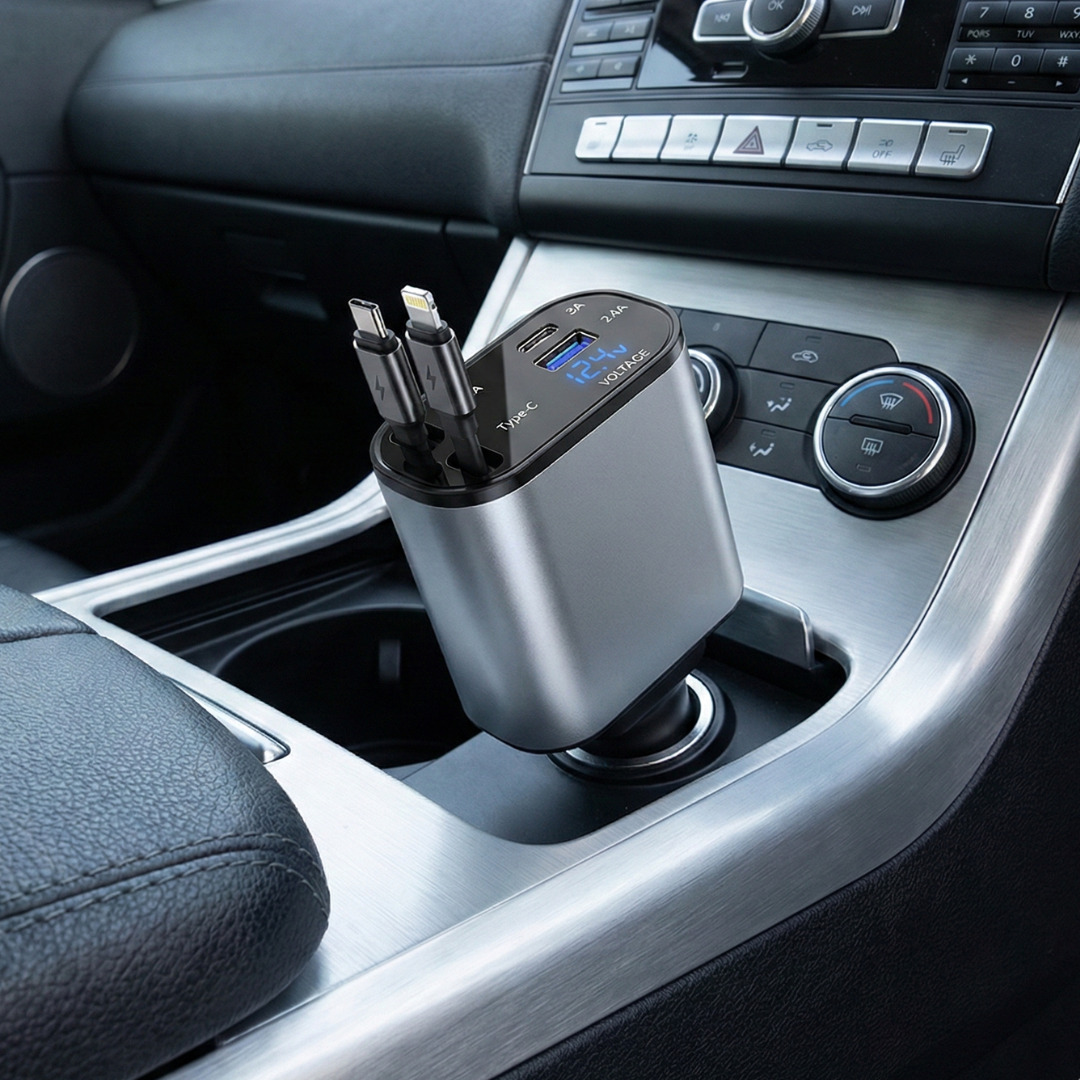 El cargador para auto de 120W con tecnología USB-PD es una solución directa para quienes necesitan carga rápida y ordenada dentro del vehículo. Su principal ventaja es la practicidad: integra 2 cables retráctiles (uno Type-C y otro para iPhone/Lightning), lo que reduce el “enredo” típico de cables sueltos y te permite cargar distintos equipos sin llevar accesorios extra.