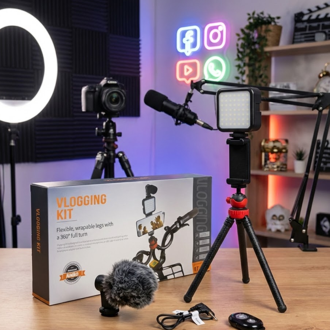Este Kit Vlogging para Smartphone está pensado para crear contenido con mejor calidad en YouTube, TikTok y grabación de conferencias, sin armar un set complejo. Incluye lo esencial para mejorar estabilidad, iluminación y audio desde el teléfono: porta smartphone, trípode flexible, luz LED con alimentación USB, micrófono y control remoto para disparo/uso a distancia. Se entrega como producto en caja.
